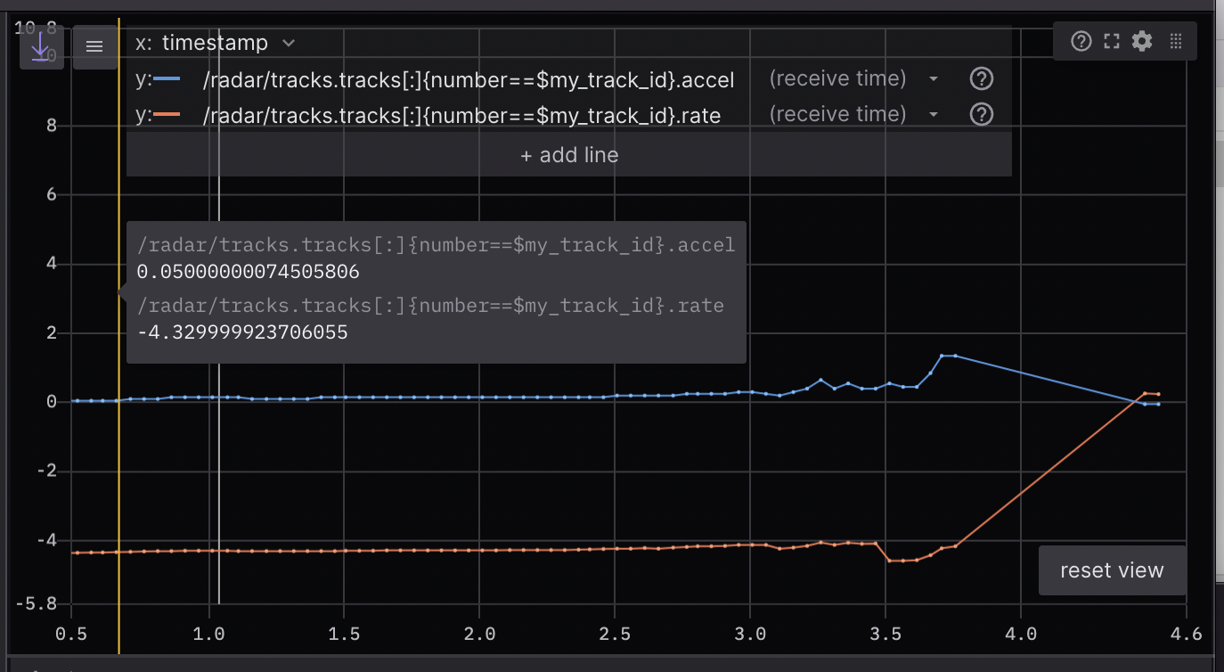 Specify the topic values you want to plot along the y-axis. For the x-axis, choose between plotting the y-axis value’s timestamp, element index, or another custom topic message path.