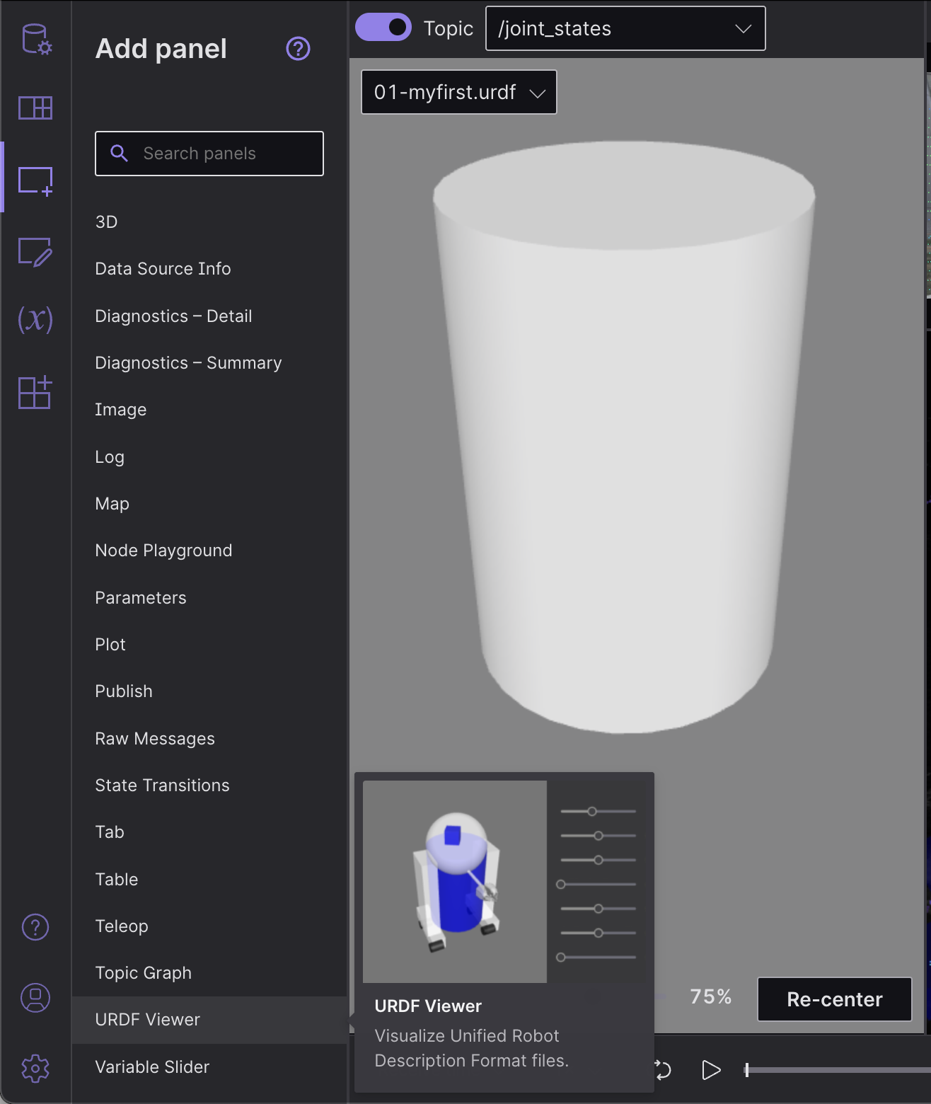Panels are modular visualization interfaces that can be configured and arranged into Studio layouts. You can also save your layouts for future use, for your own personal reference or with your larger robotics team.