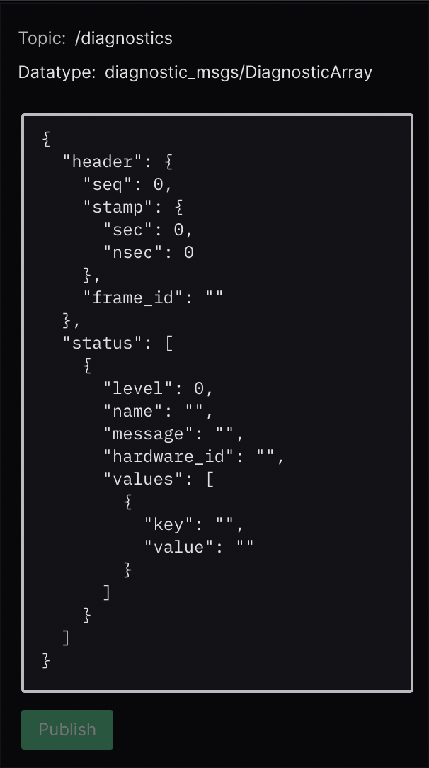 Selecting a datatype in the dropdown of common ROS datatypes will also populate the text field with a JSON message template.