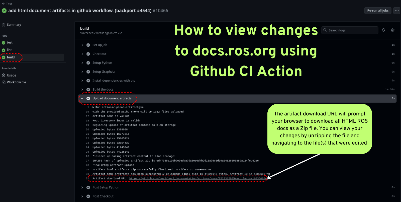 For small changes to the ROS 2 Docs you can view your changes as rendered HTML using artifacts generated in our Github Actions. The “build” action produces the entire ROS Docs as a downloadable Zip file that contains all HTML for docs.ros.org This build action is triggered after passing the test action and lint action.